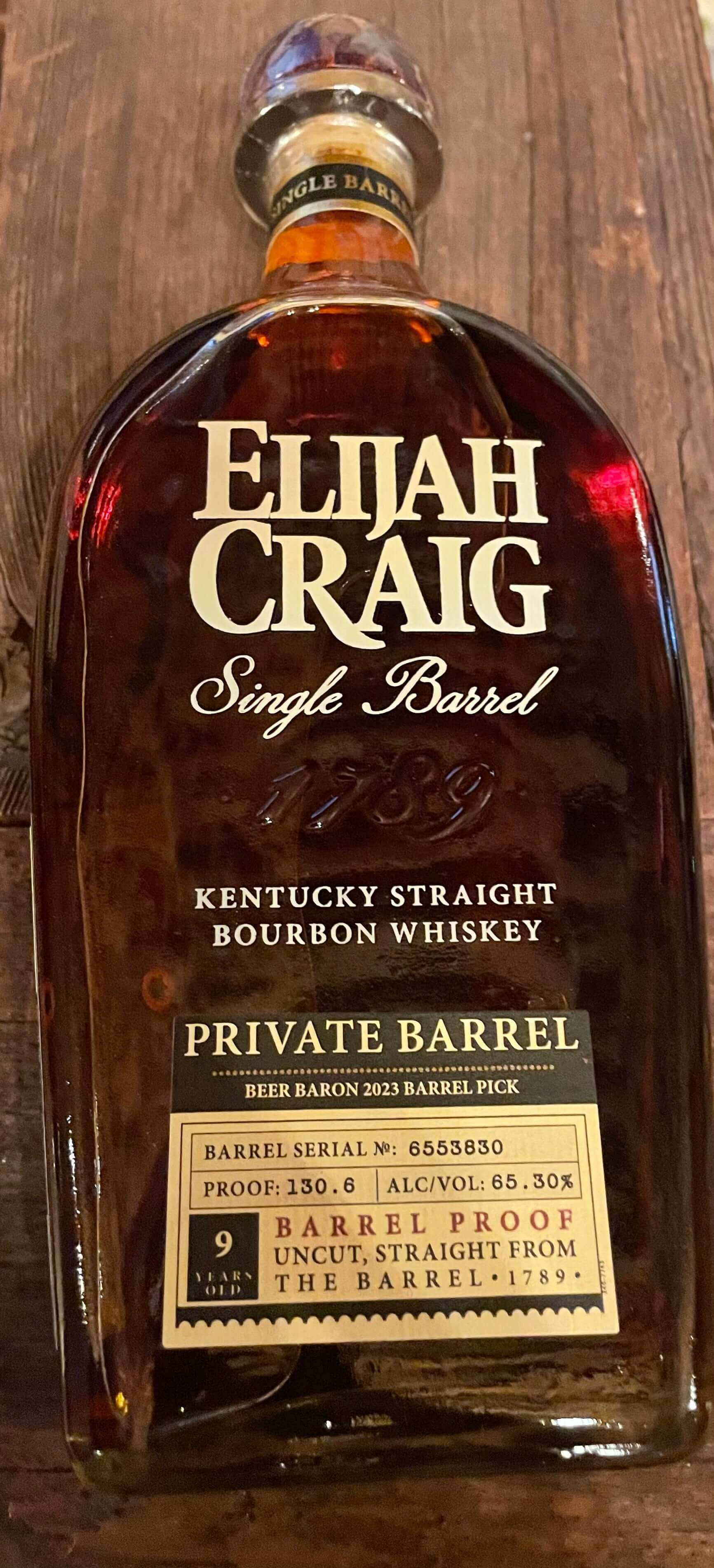 Elijah Craig Private Barrel Beer Baron 2023 Barrel Proof delivers an intensely flavorful bourbon experience. Aged for 9 years, it has a robust proof of 130.6 and a complex flavor profile that includes notes of toasted oak, cinnamon, nutmeg, and caramel. Enjoy a luxurious, smooth finish with every sip.